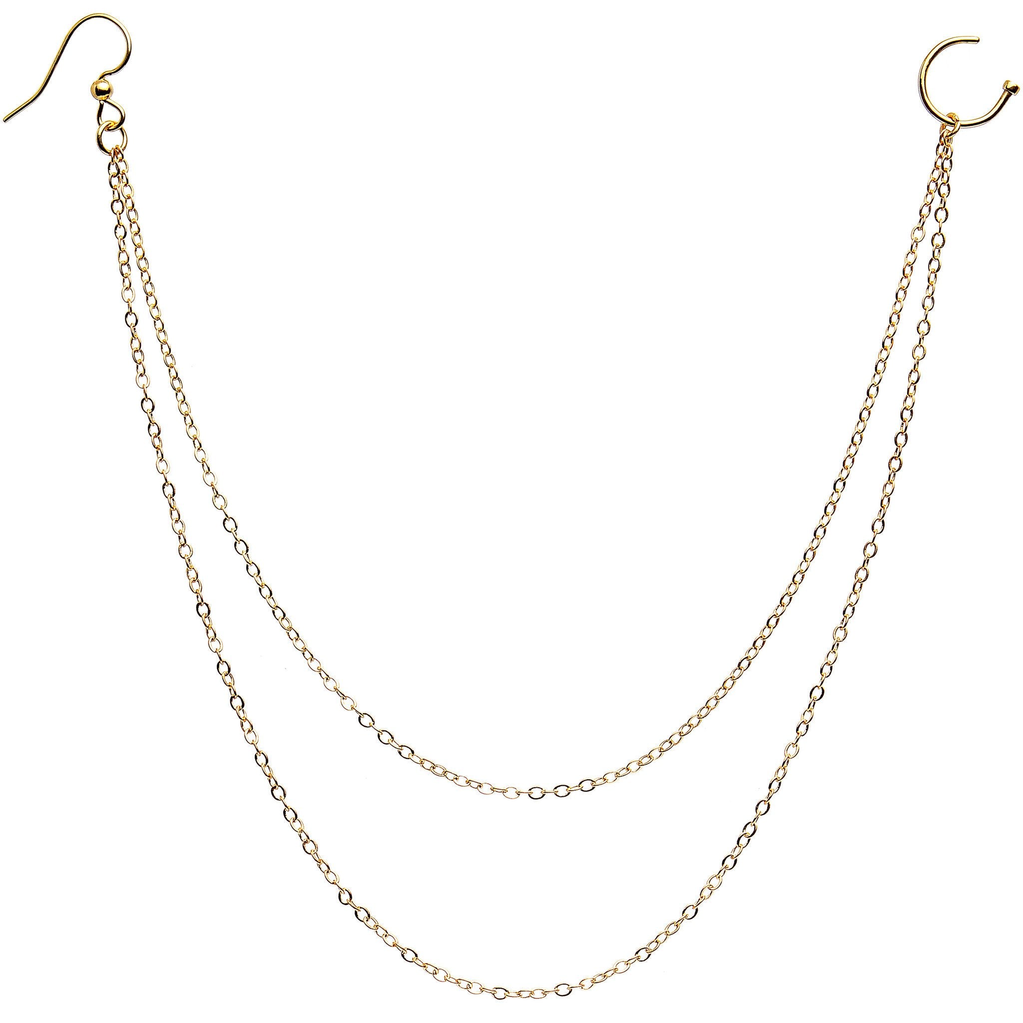 Get ready to pillage and plunder with this gold-plated earring to nose chain. 20 gauge 5/16" nose hoop to earring for pierced ear and nose.