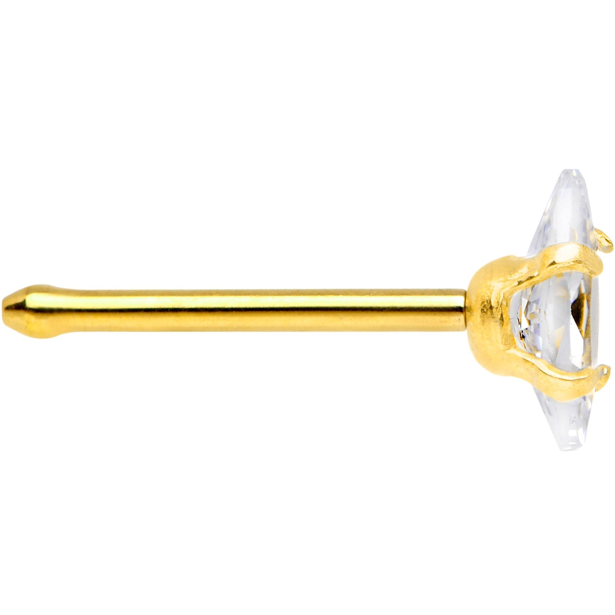 If you're looking for an eye-catching new look for your nose piercing, then look no further because this 20 gauge nose bone is exactly what you need to step up your style. The 6mm length straight post is made from gold IP over 316L surgical grade stainless steel and features a clear cubic zirconia ellipse-shaped gem that demands attention.