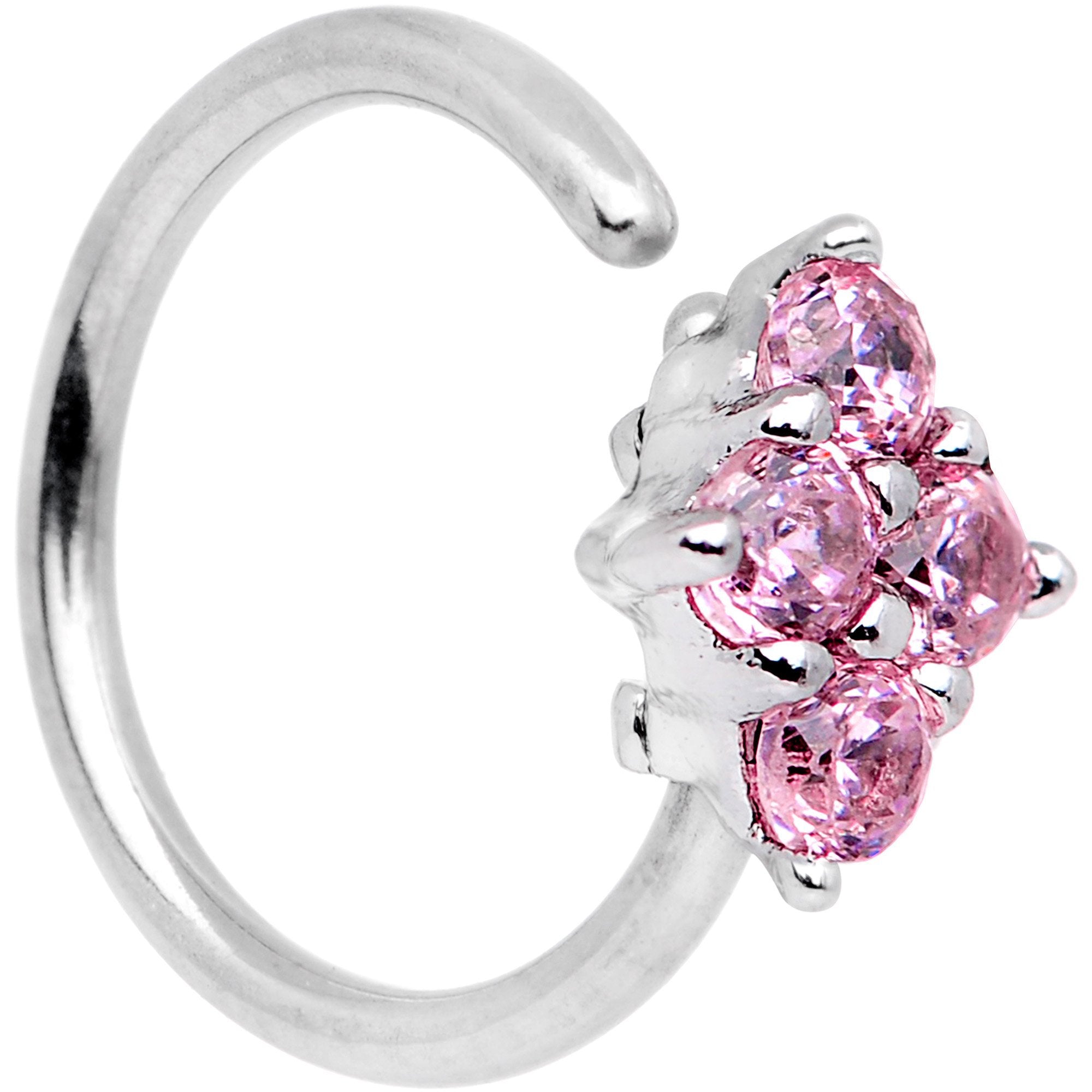 If you're into simple and easy to use universal jewelry this pretty 20 gauge nostril ring is right up your alley. Made with an adjustable 8mm durable 316L surgical grade stainless steel circular ring, this nose hoop is set with a pink cubic zirconia gem cluster and features ends that can be twisted open and then twisted shut again to easily to fit into your nose piercing. This universal body jewelry can be used for multiple piercings including your nostril, cartilage, or any other place that is a perfect fit for you!